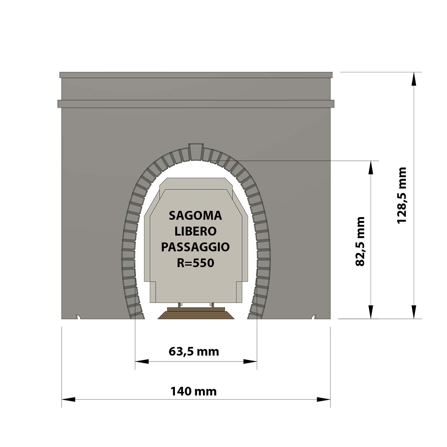 Il prodotto è pensato per essere abbinabile al tunnel codice 1051.R550 per curve larghe (raggio R5) e agli accessori come una colonna in pietre per portali con codice 1052 e ai muri laterali di contenimento codice 1053.