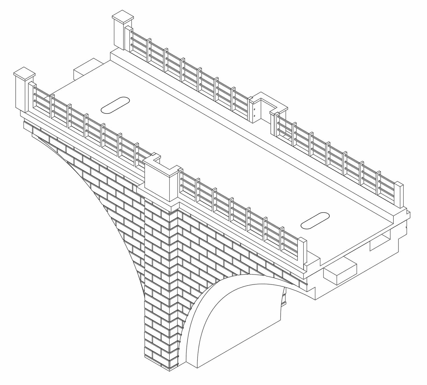 Riproduzione in scala H0 (1:87), di una ringhiera alternativa per l'arcata grande del ponte in muratura, adatta sia al ponte a singolo binario (codice iniziale 1007) che al ponte a doppio binario (codice iniziale 1008).
