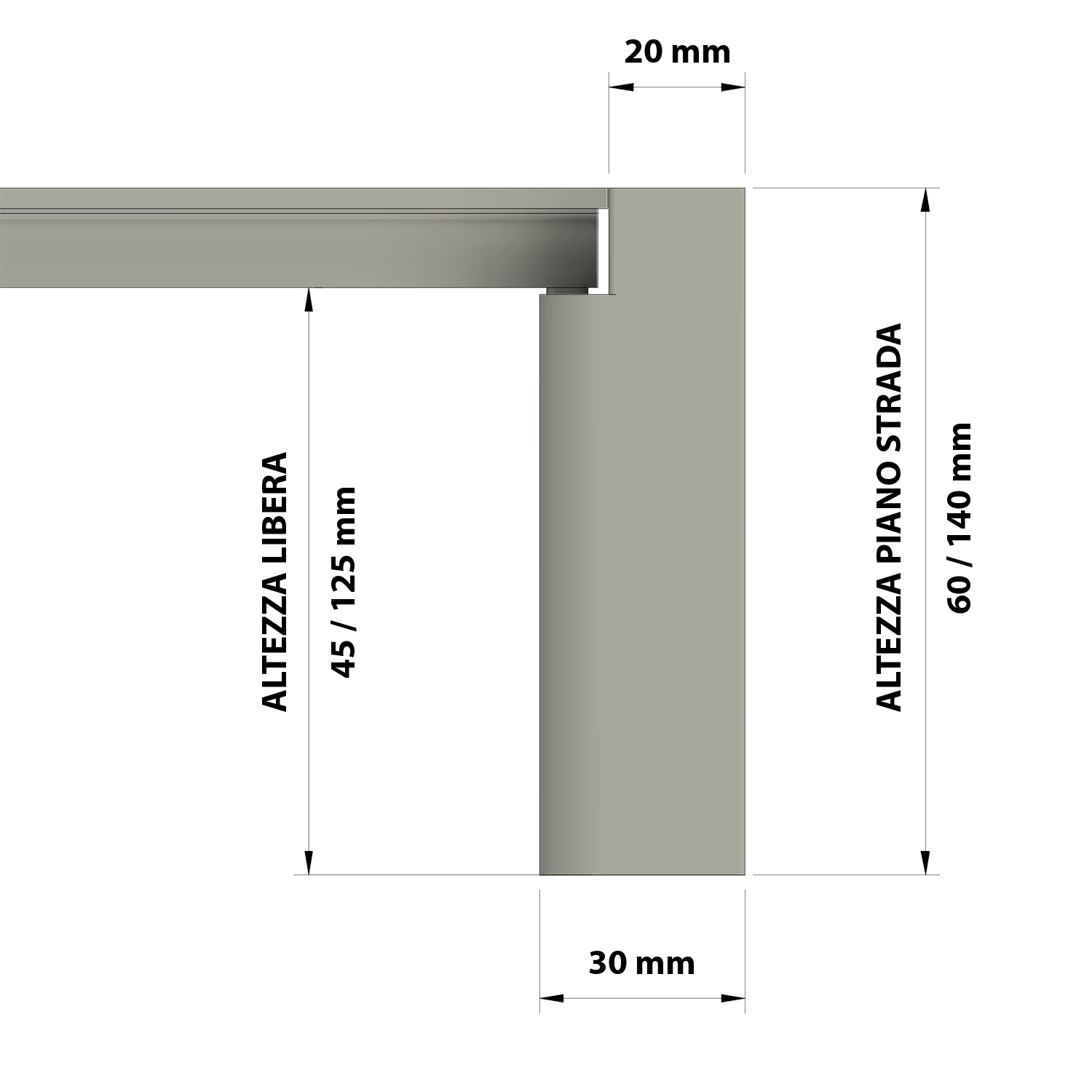 - Altezza piano strada personalizzabile su richiesta da 60 mm a 140 mm.