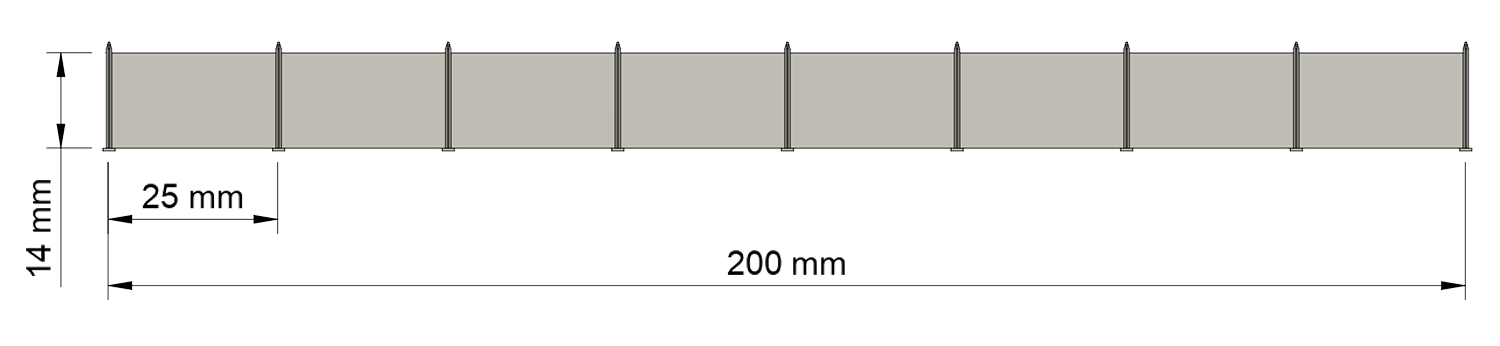 Der Bausatz besteht aus 4 Abschnitten mit 200 mm Länge, insgesamt 800 mm, Höhe 14 mm und kann mit weiteren Elementen des gleichen Typs erweitert werden.