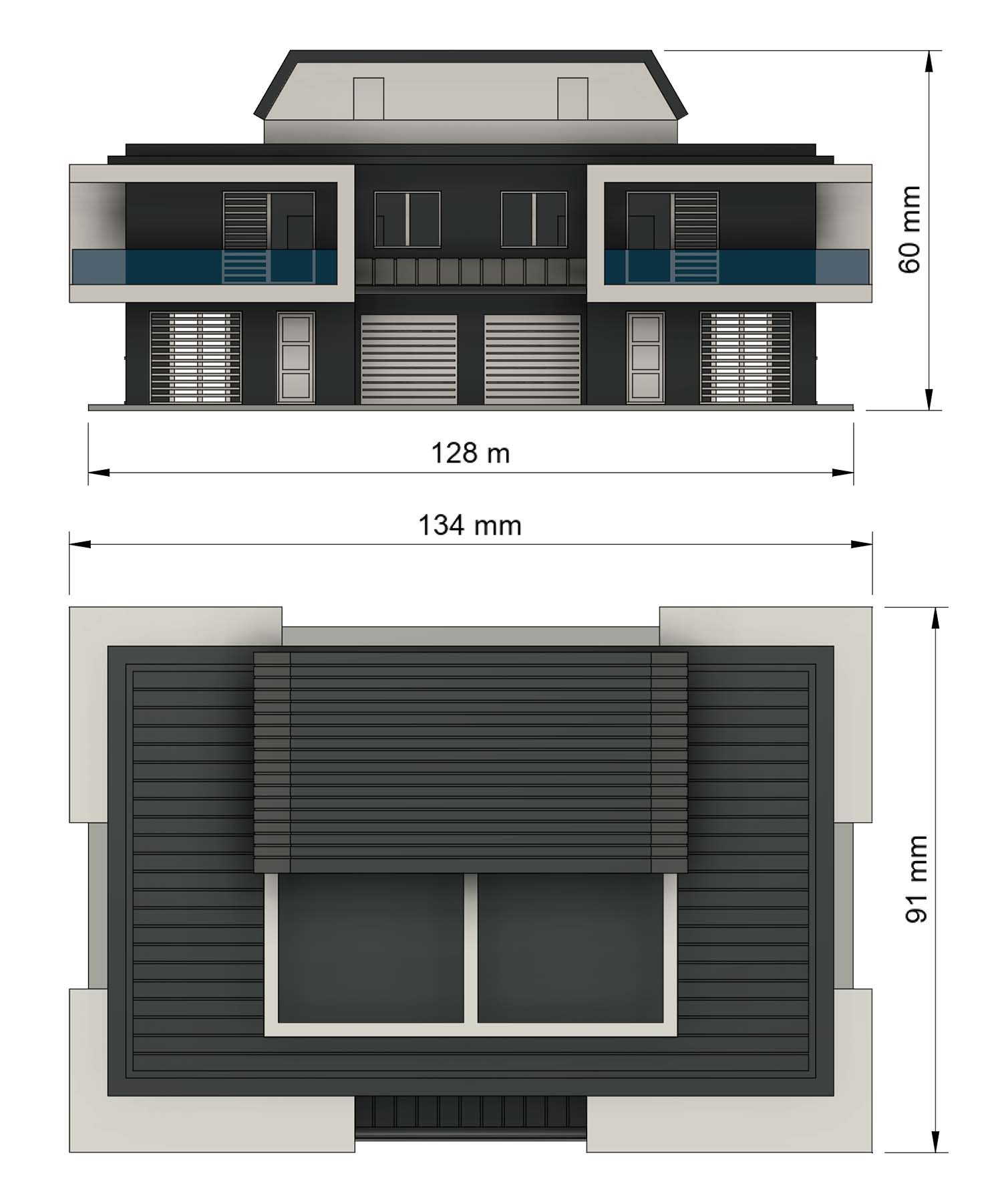 Nachbildung eines modernen zweistöckigen Doppelhauses im Maßstab N (1:160) für Modelle mit zeitgenössischem Ambiente.
