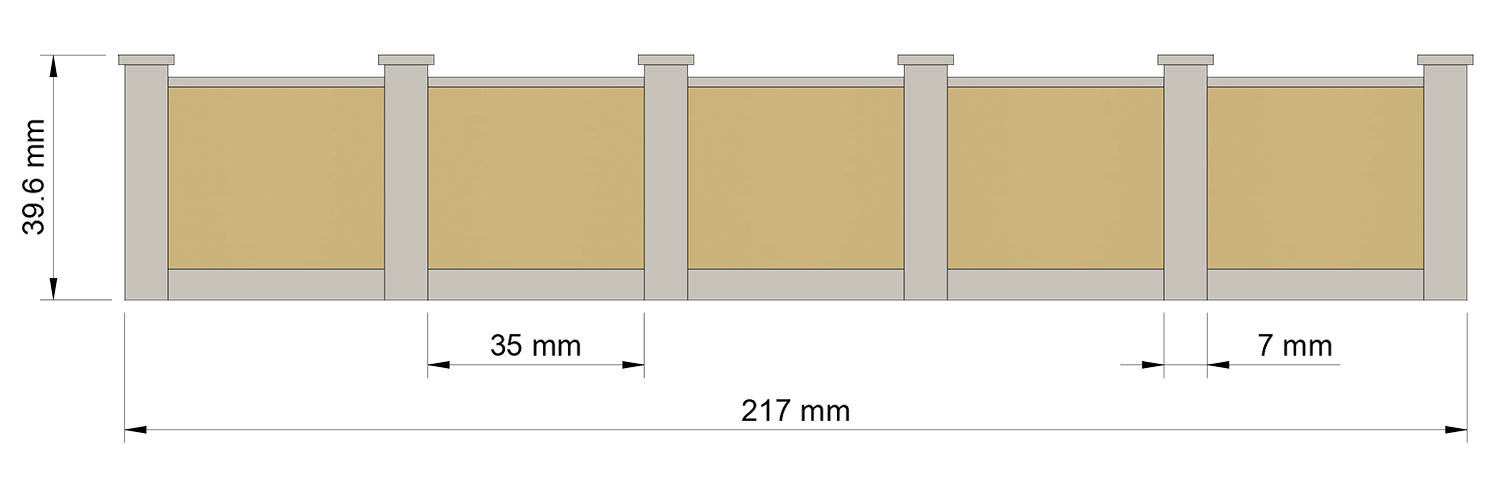 Grenz- oder Umfassungsmauerbausatz, typisch für die FS-Eisenbahnen der Epochen III und IV, aus Beton und Gips, bestehend aus 6 Betonimitatsäulen und 5 verputzten Wandabschnitten.