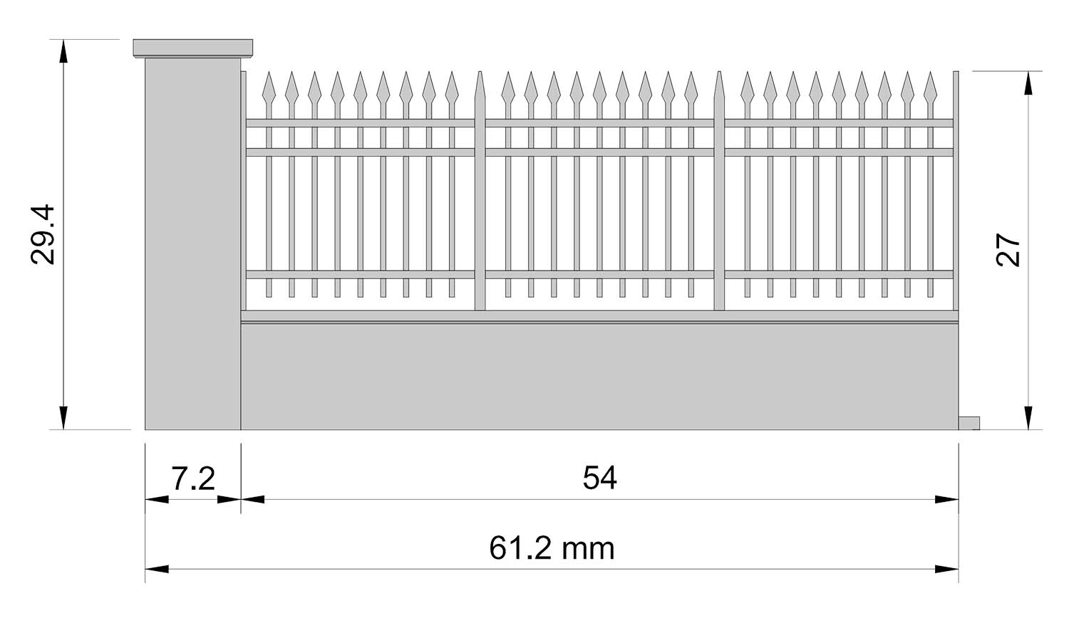 Abschnitt zur Verlängerung der gemauerten Begrenzungsmauer oder des Zauns mit Geländer, bestehend aus 1 Säule, 1 niedriger Mauer (8 mm) und 1 Geländer.