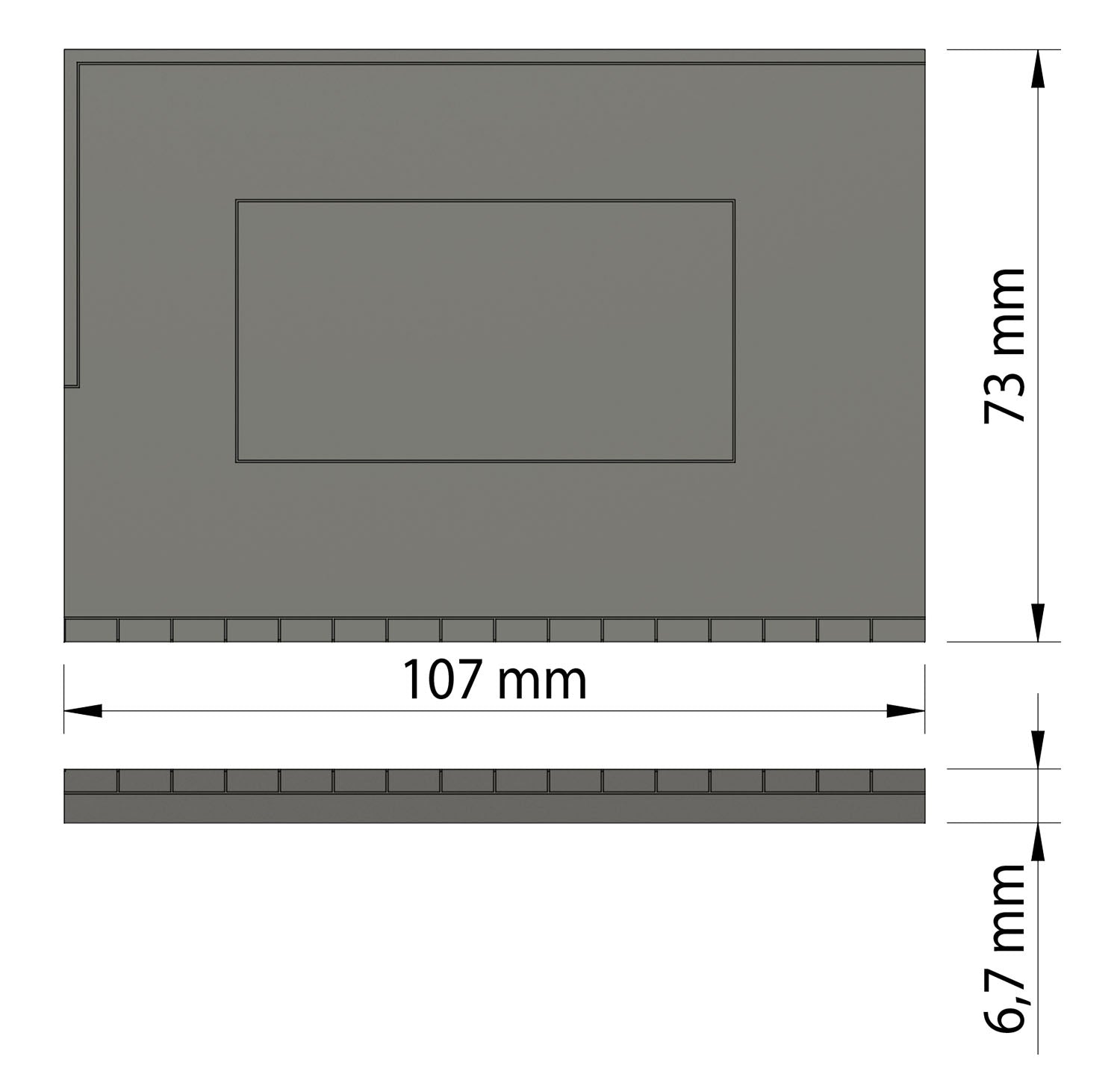Maße 107 x 73 mm und Höhe 6,7 mm.