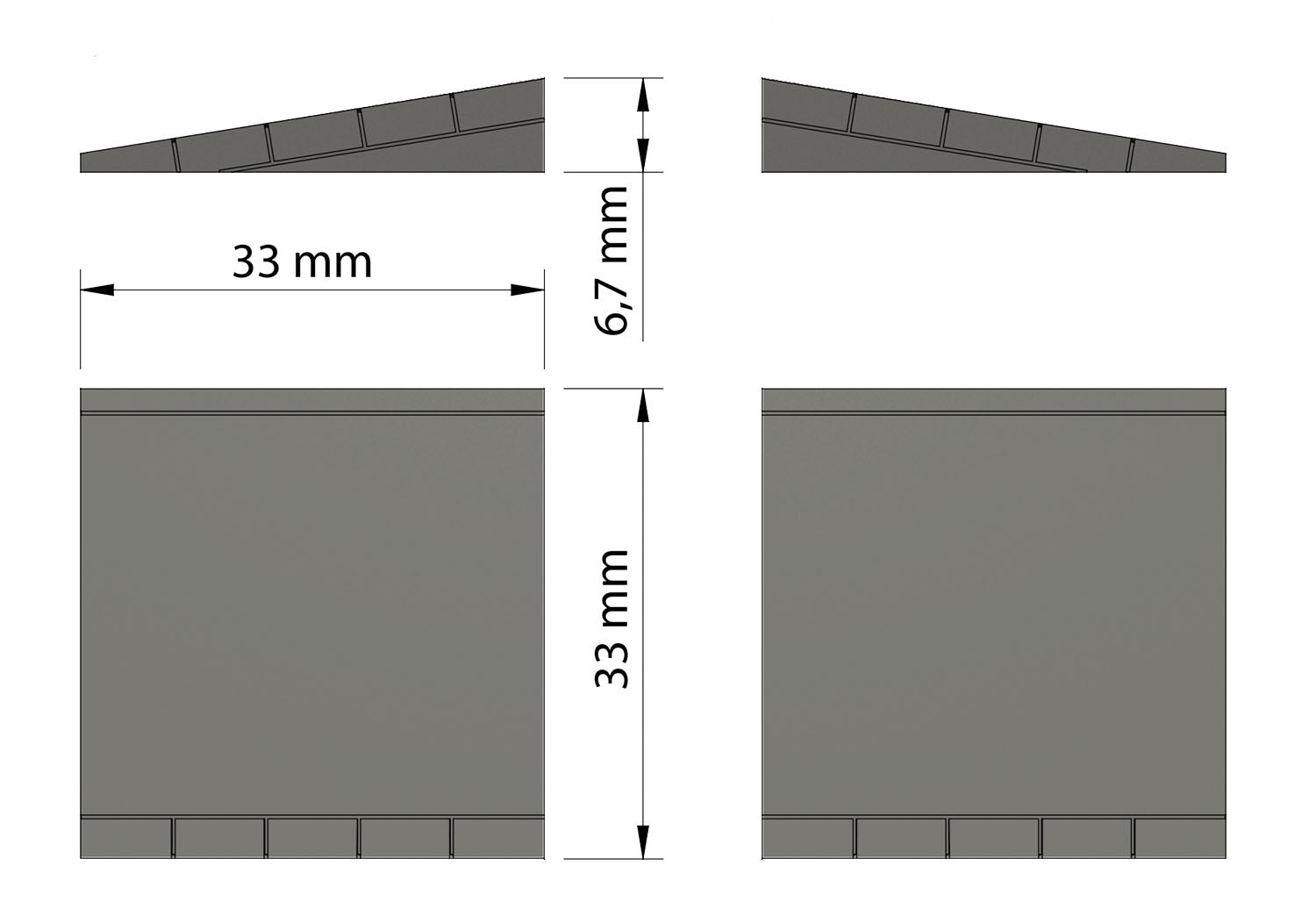 Maße: Länge 33 mm, Breite 33 mm und Höhe 6,7 mm.