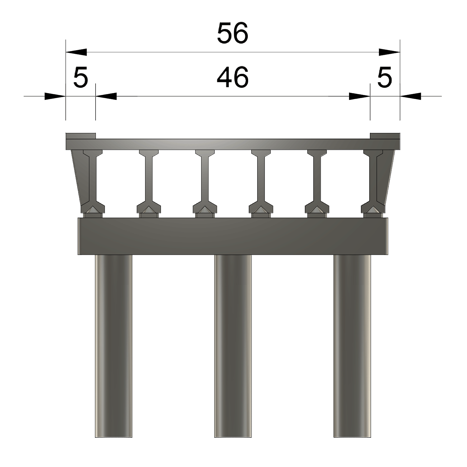 Die Gesamtbreite der Brücke (56 mm), der Fahrbahnoberfläche (46 mm) und der Gehwege (5 mm) entnehmen Sie bitte der Maßzeichnung.
