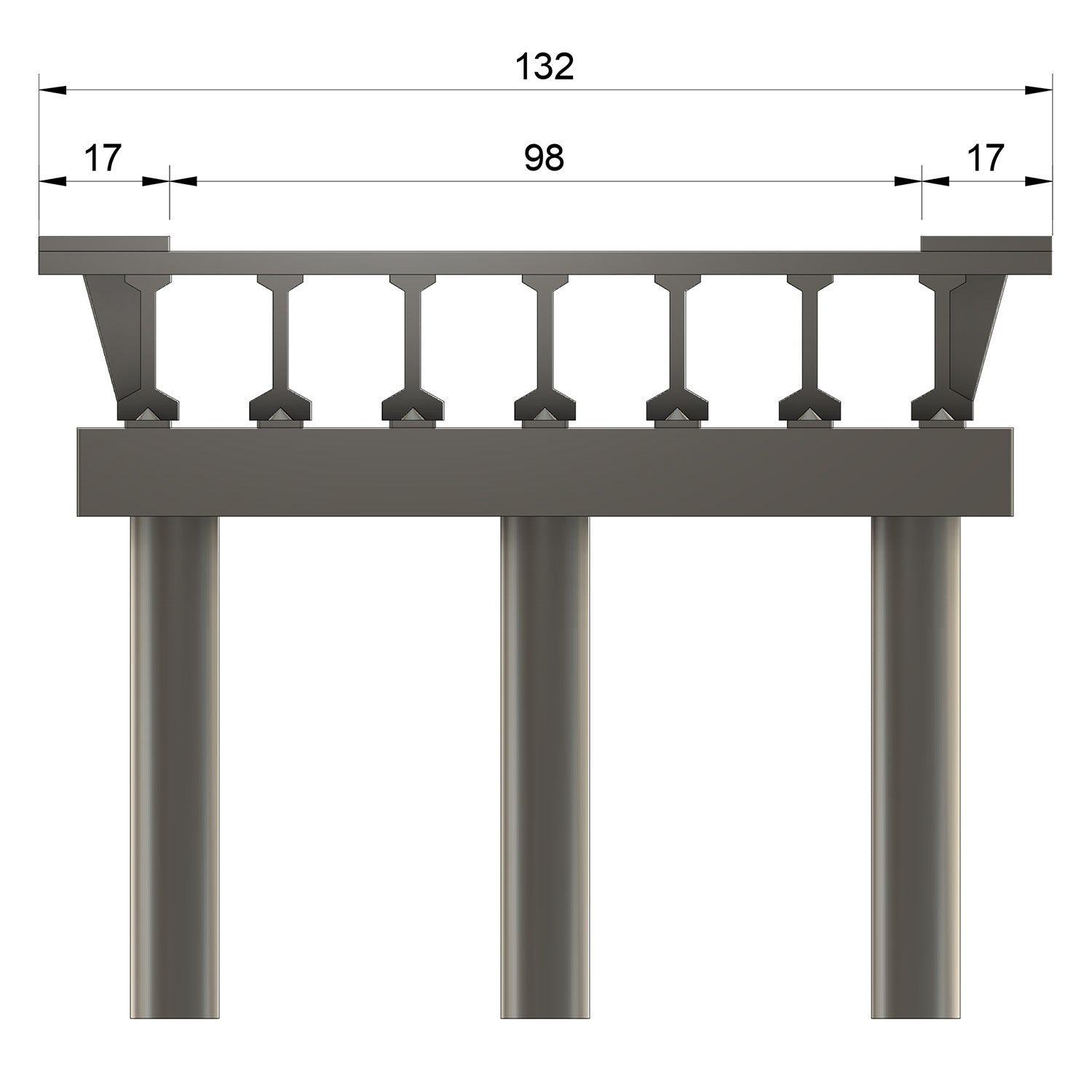 Die Gesamtbreite der Brücke (132 mm), der Fahrbahnoberfläche (98 mm) und der Gehwege (17 mm) entnehmen Sie bitte der Maßzeichnung.