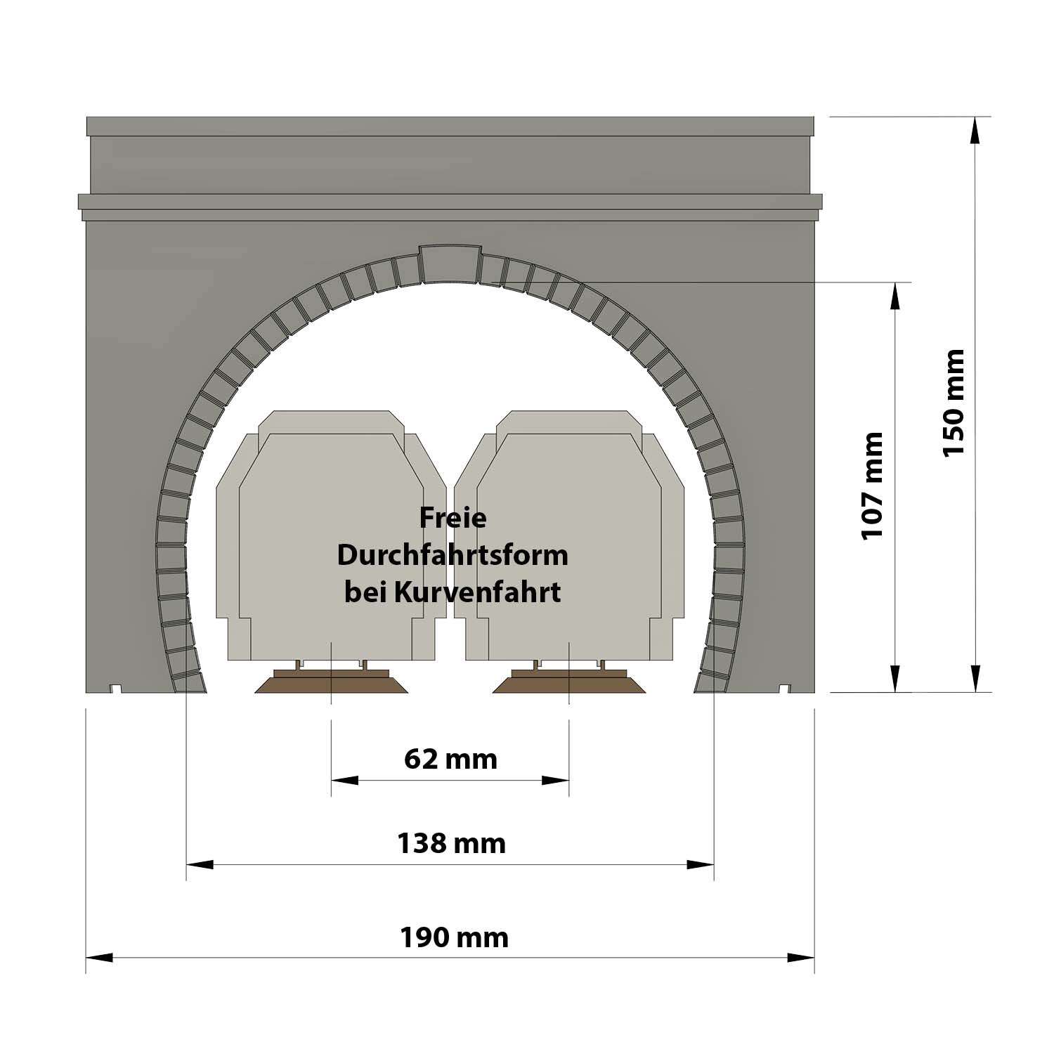 Nachbildung eines Tunnelportals im H0-Maßstab (1:87). Für zweigleisige Eisenbahnstrecken geeignet für das Kurvenpaar mit Radius R2-R3 (Innenradius 420 mm und Außenradius 482 mm) mit einem Gleisabstand von 62 mm. Es ist möglich, Radien ähnlicher Kurven mit einer Toleranz von ca. 10 % zu verwenden.