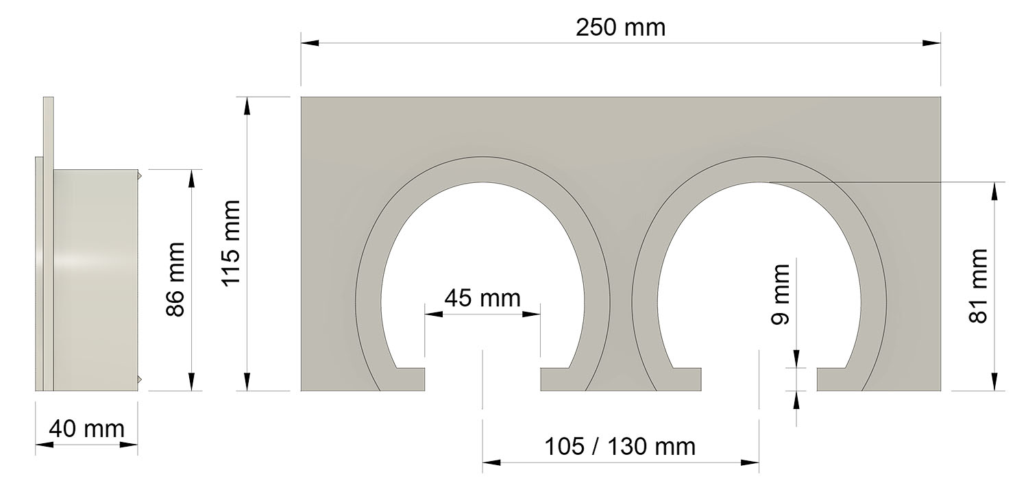 Nachbildung eines Doppeltunnelportals im H0-Maßstab (1:87). für klassische und Hochgeschwindigkeitsbahnstrecken, mit einem Abstand zwischen den beiden Gleisen von 108 mm. Der Abstand der beiden Portale kann individuell an den Gleismittenabstand von 105 mm bis 130 mm angepasst werden.