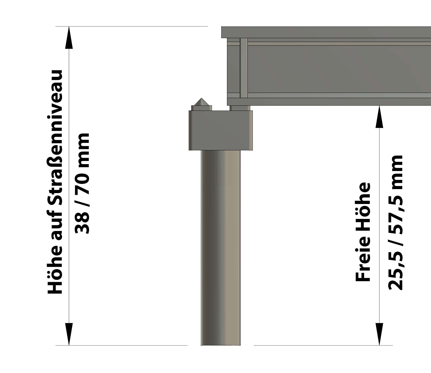 - Fahrbahnhöhe anpassbar von minimal 38 mm bis maximal 62 mm (bei freier Höhe immer 12,5 mm weniger)