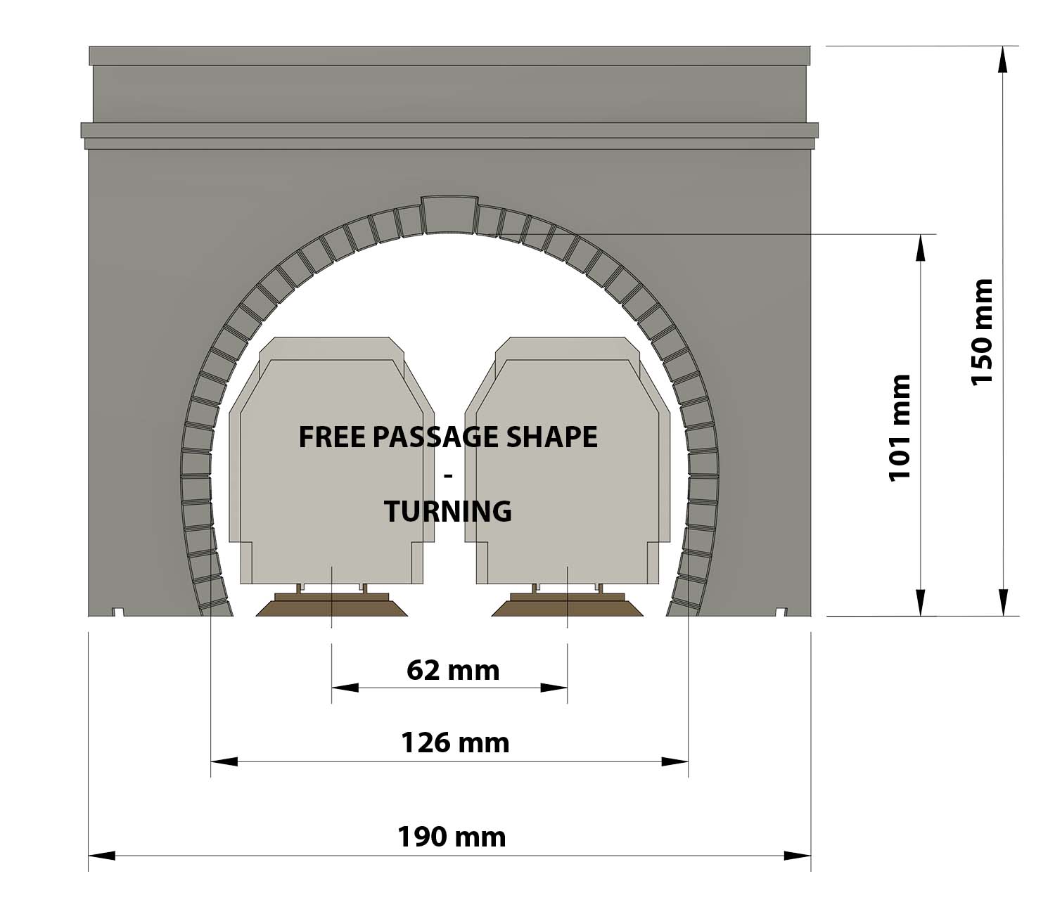 H0 scale reproduction (1:87) of a tunnel portal for double track railway lines suitable for the pair of curves with radius R4-R5 (internal radius of 543 mm and external radius of 605 mm) with distance between tracks of 62 mm. It is possible to use radius of similar curves with a tolerance of approximately 10%.