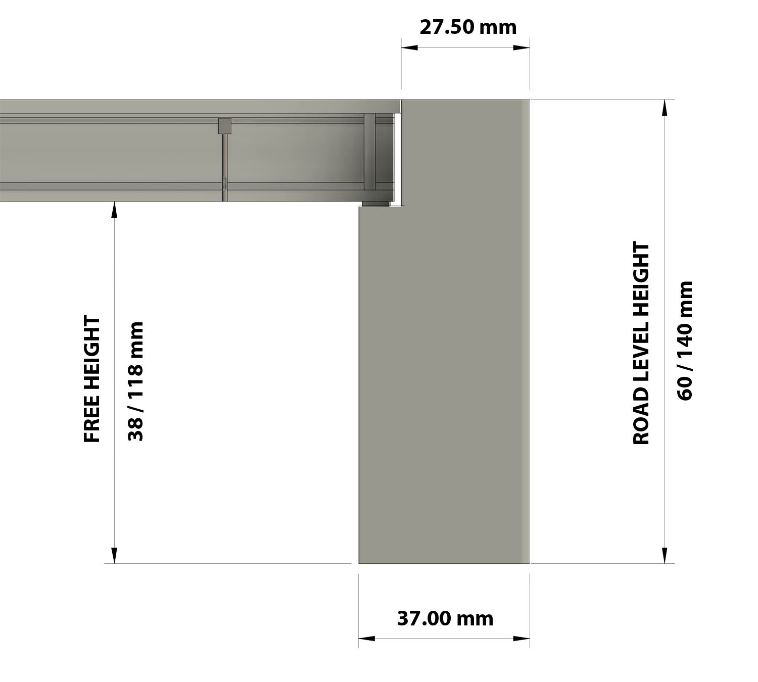 - Height from road level: 80 mm (real life equivalent approximately 7.00 metres) and free height of 58 mm (real life equivalent approximately 5.00 metres)