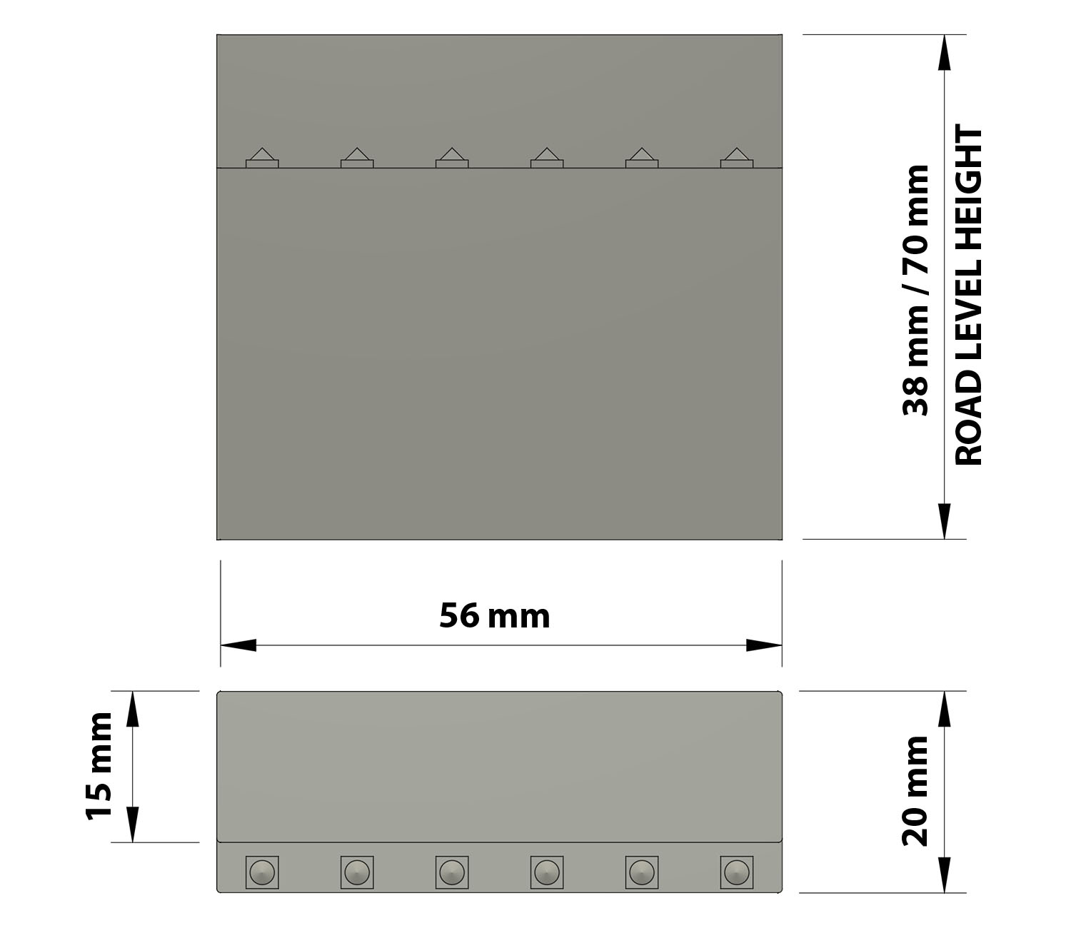 • Road surface height customizable from a minimum of 38 mm to a maximum of 70 mm (free height always 12.5 mm less)