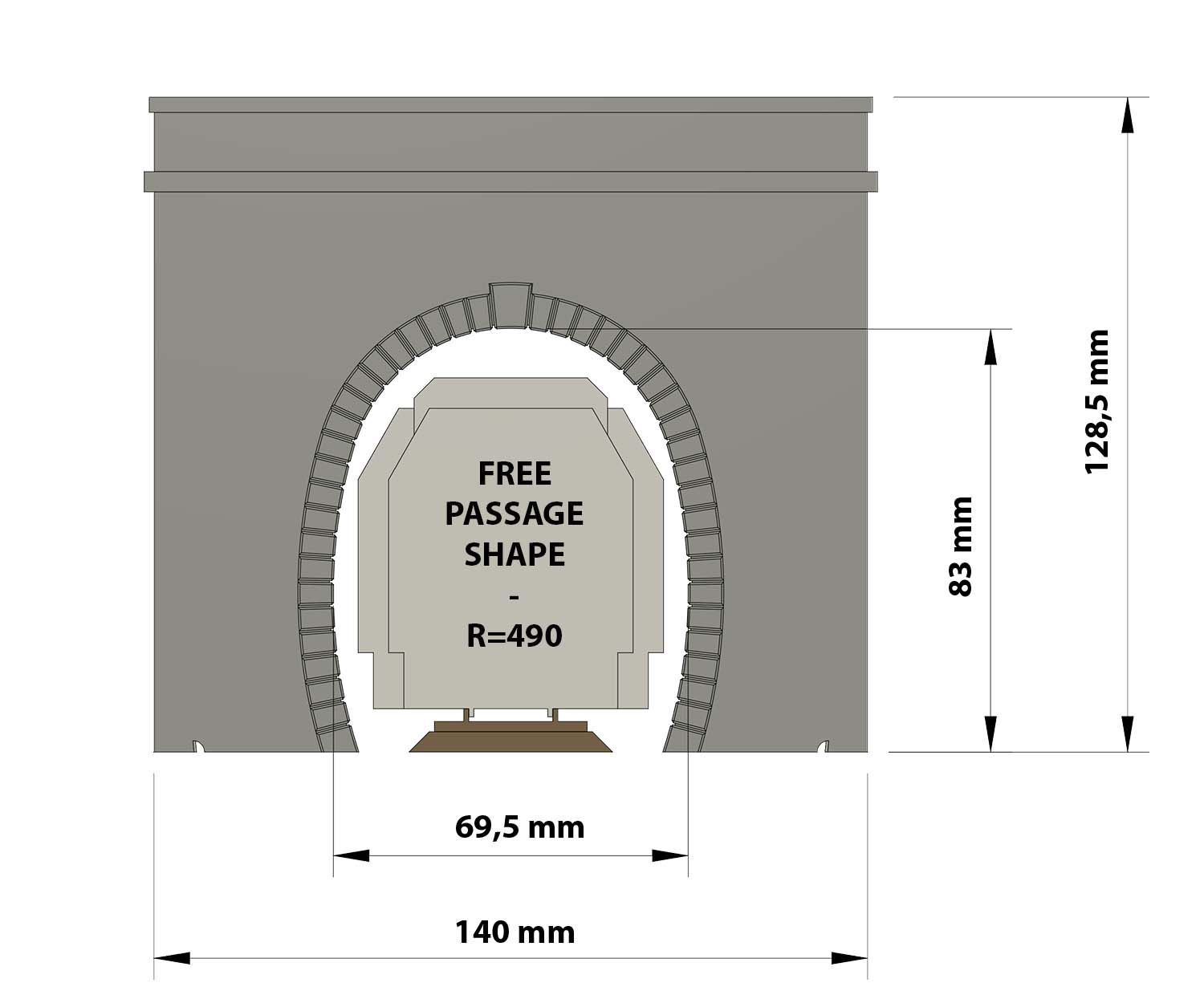 H0 scale reproduction (1:87) of a tunnel portal for single track railway lines. Tunnel entrance widened according to NEM standards for modeling to adapt it to curved lines with an average radius of 490 mm (spokes R3 - R4), but is compatible with radiuses from 470 to 520 mm. Suitable for both lines with and without catenary.