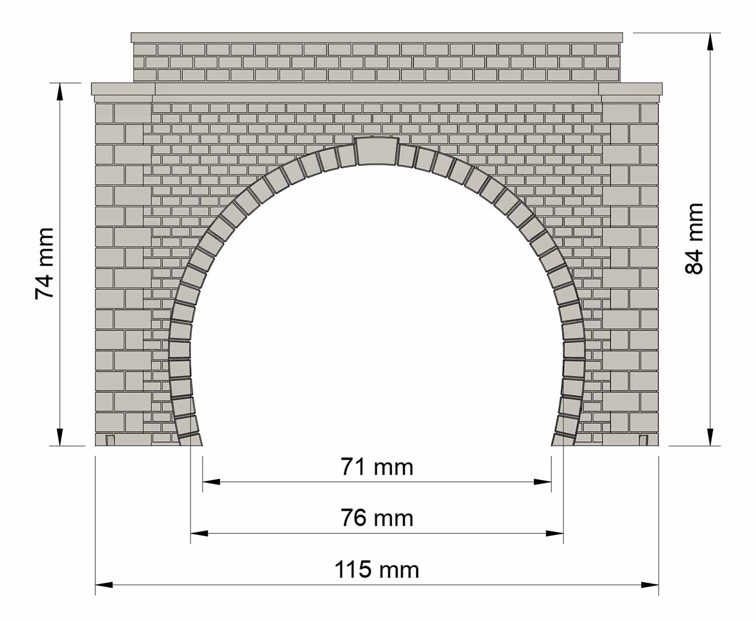 N scale reproduction (1:160) of a tunnel portal for double track railway lines suitable for the pair of sharp curves with radius R1-R2 (internal radius of 192 mm and external radius of 226 mm) with standard distance between the tracks of 33.6 mm. It is possible to use radii of similar curves with a tolerance of approximately 10%.