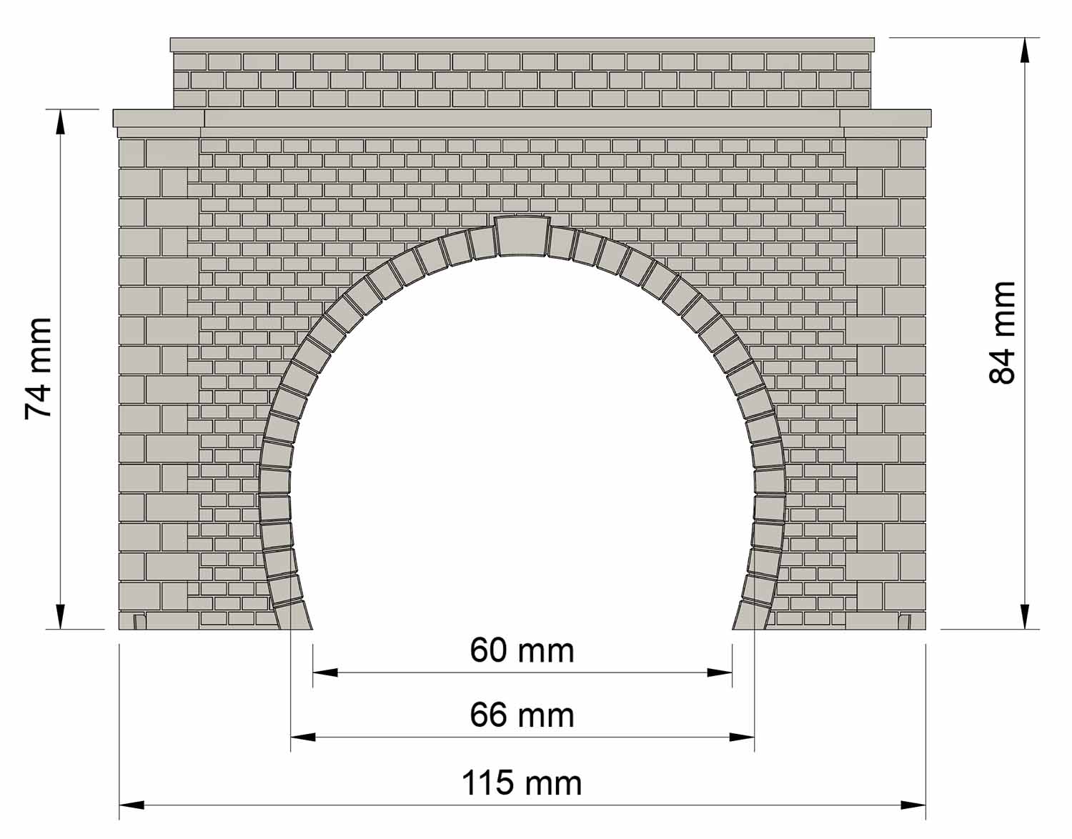 N scale reproduction (1:160) of a tunnel portal for double track railway lines with standard track spacing of 33.6 mm. Suitable only for straight lines thanks to the tunnel entrance reduced in width for greater realism, similar to life. Suitable for both lines with and without catenary.