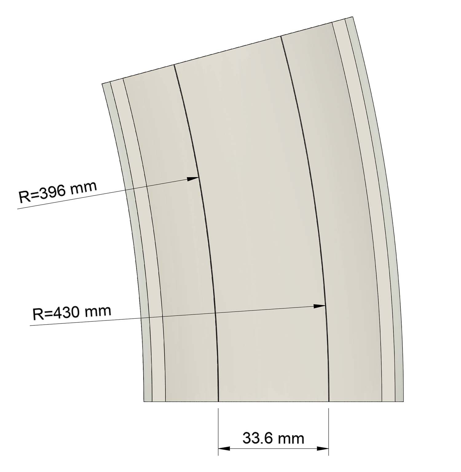 N scale (1:160) reproduction of an internal tunnel of a gallery for double track railway lines suitable for wide curve pair with radius R6-R7 (396mm internal radius and 430mm external radius) with standard track spacing of 33.6mm. It is possible to use similar curve radii with a tolerance of approximately 10%.