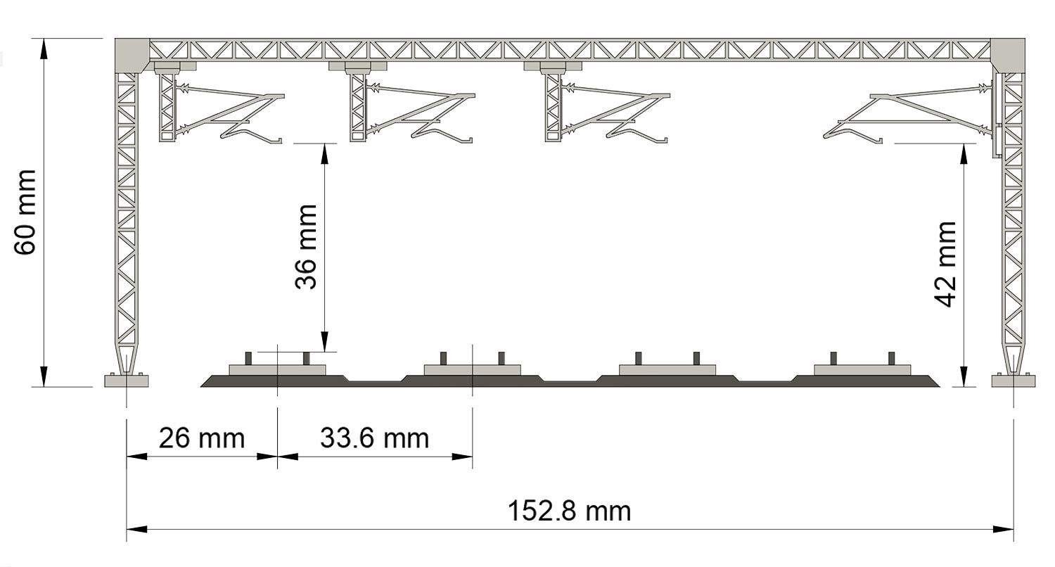 The product is supplied in kit form to adapt it to the required intertrack and it is possible to cut the beam to size to adapt it to your intertrack needs. It is easy and quick to assemble and is suitable for plastic models, dioramas and operational modules but with non-functional overhead line.