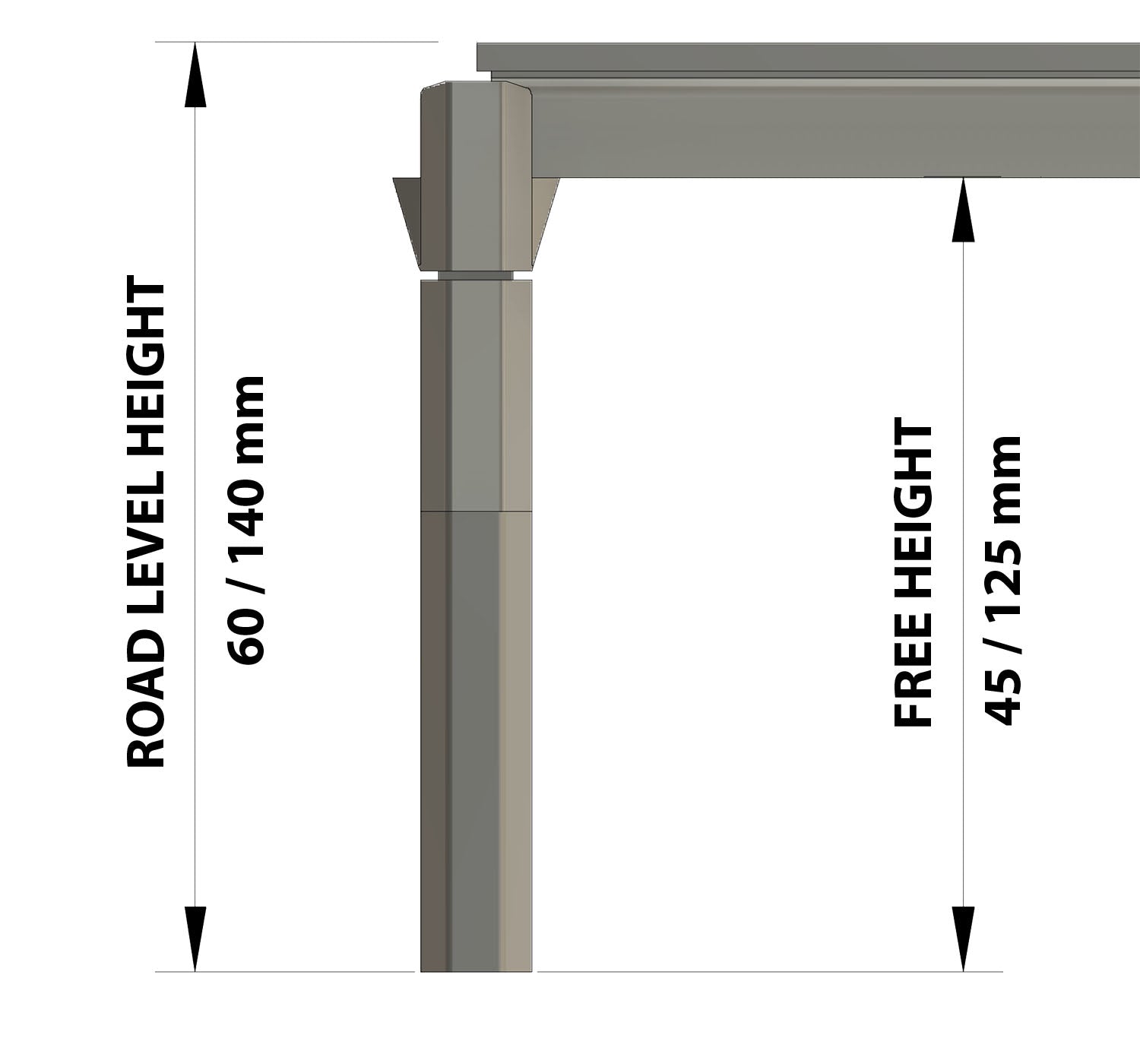 • Height from road level: 100 mm (real life equivalent approximately 8.70 metres) and free height of 85 mm (real life equivalent approximately 7.40 metres)