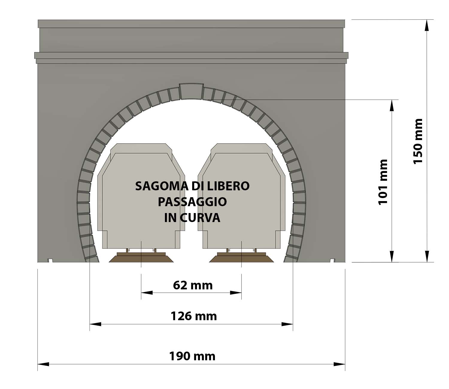 Il prodotto è pensato per essere abbinabile al tunnel codice 1061.R45 per curve raggio R4-R5 con interbinario massimo di 62 mm e agli accessori come le colonne in pietre per portali con codice 1062 e ai muri laterali di contenimento codice 1063.