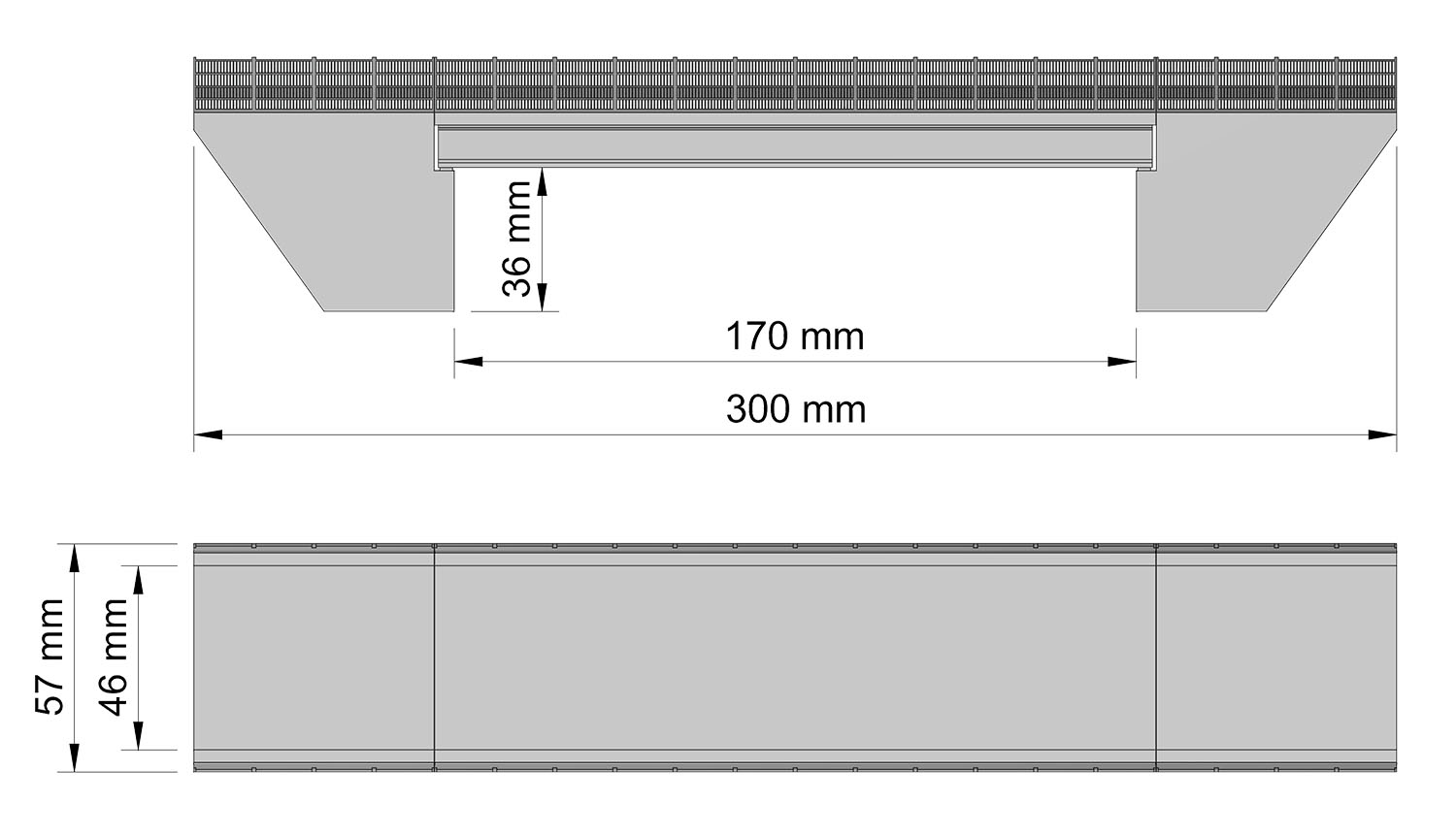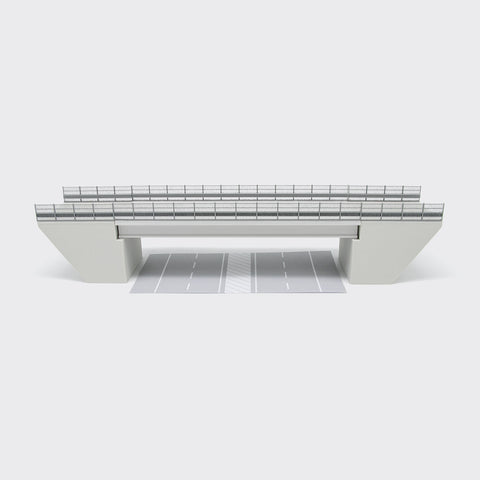 Riproduzione in Scala N (1:160) di un cavalcavia per strade e autostrade con luce libera verticale reale superiore ai 5 metri, valore tipico nelle strade e autostrade (36 mm in scala).